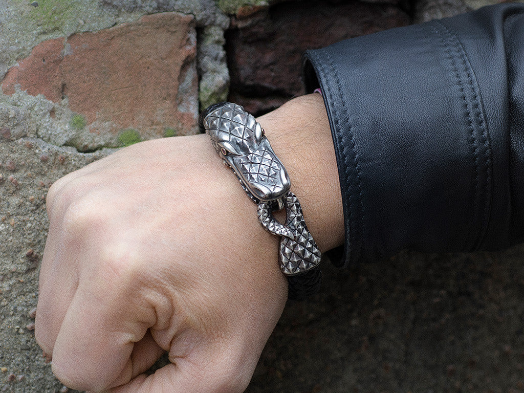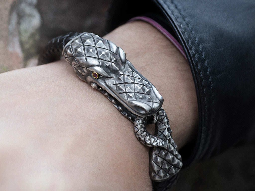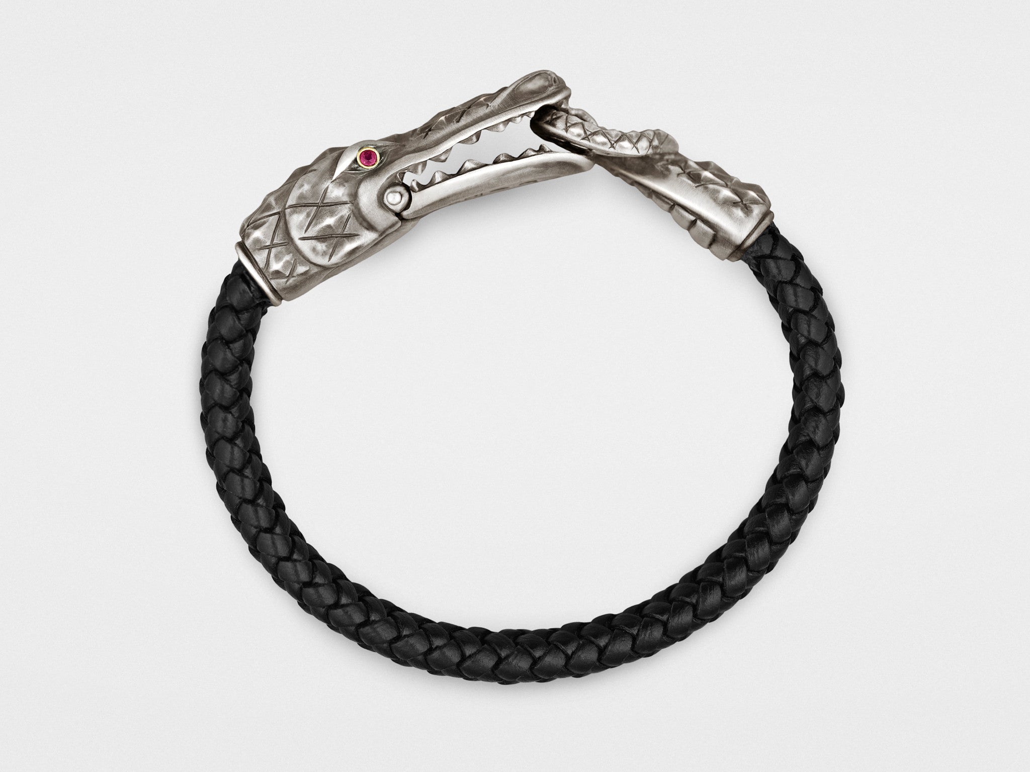 Inspired by the steely-eyed prehistoric predator, this leather bracelet with oversized 925 sterling silver alligator clasp looks the part. The exceptionally detailed piece, set with two ruby eyes in 18kt gold frames, is made to order in our New York City workshop.