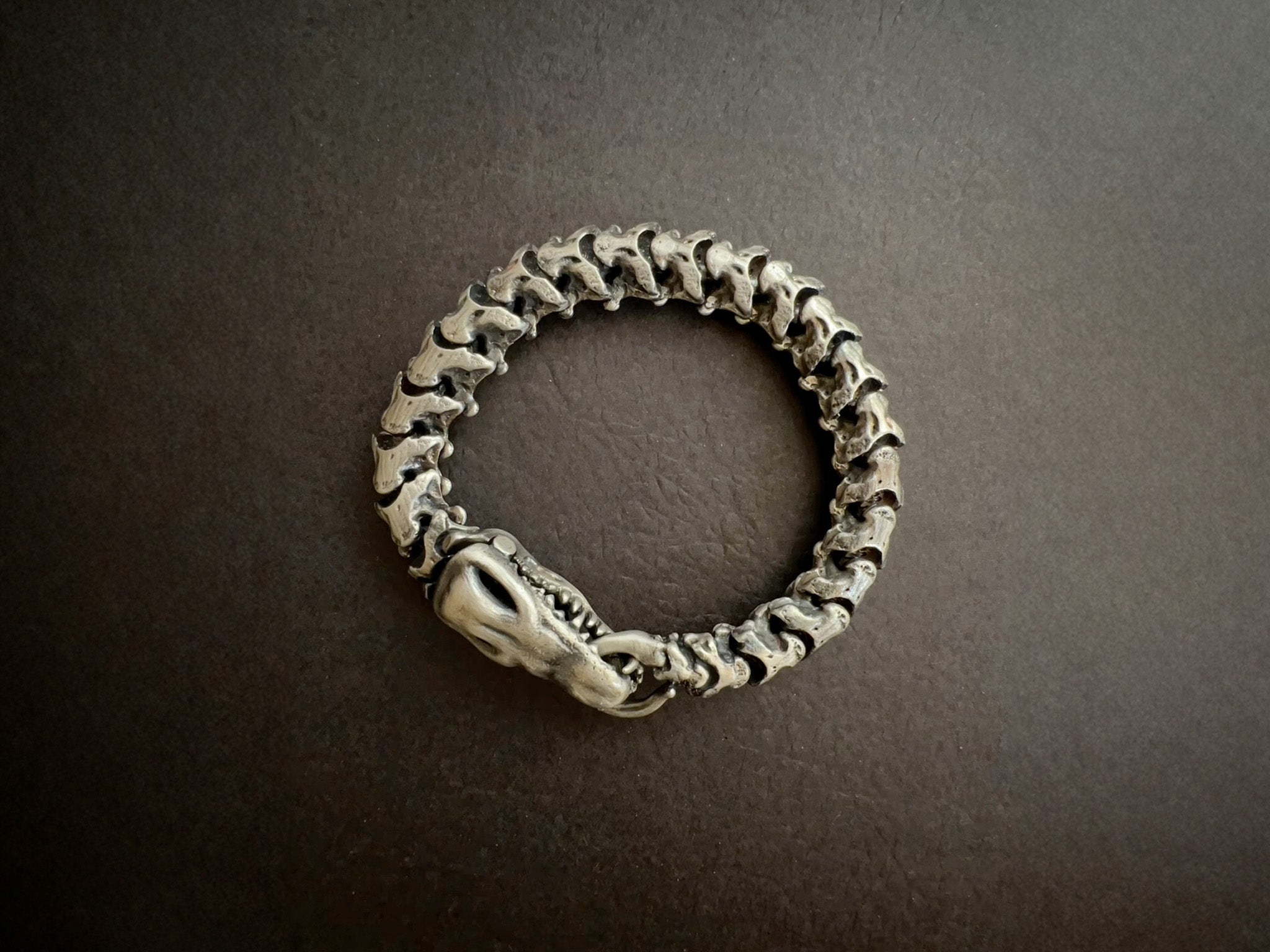 Crafted with precision in sterling silver, this bracelet boasts a distinctive design inspired by the graceful curves of snake vertebrae. Each piece is a testament to meticulous craftsmanship, offering you a unique blend of nature-inspired artistry and timeless elegance. Elevate your style with this handcrafted masterpiece that captures the essence of sophistication and individuality. Designed and handcrafted by Anatoly Startsev in sterling silver.