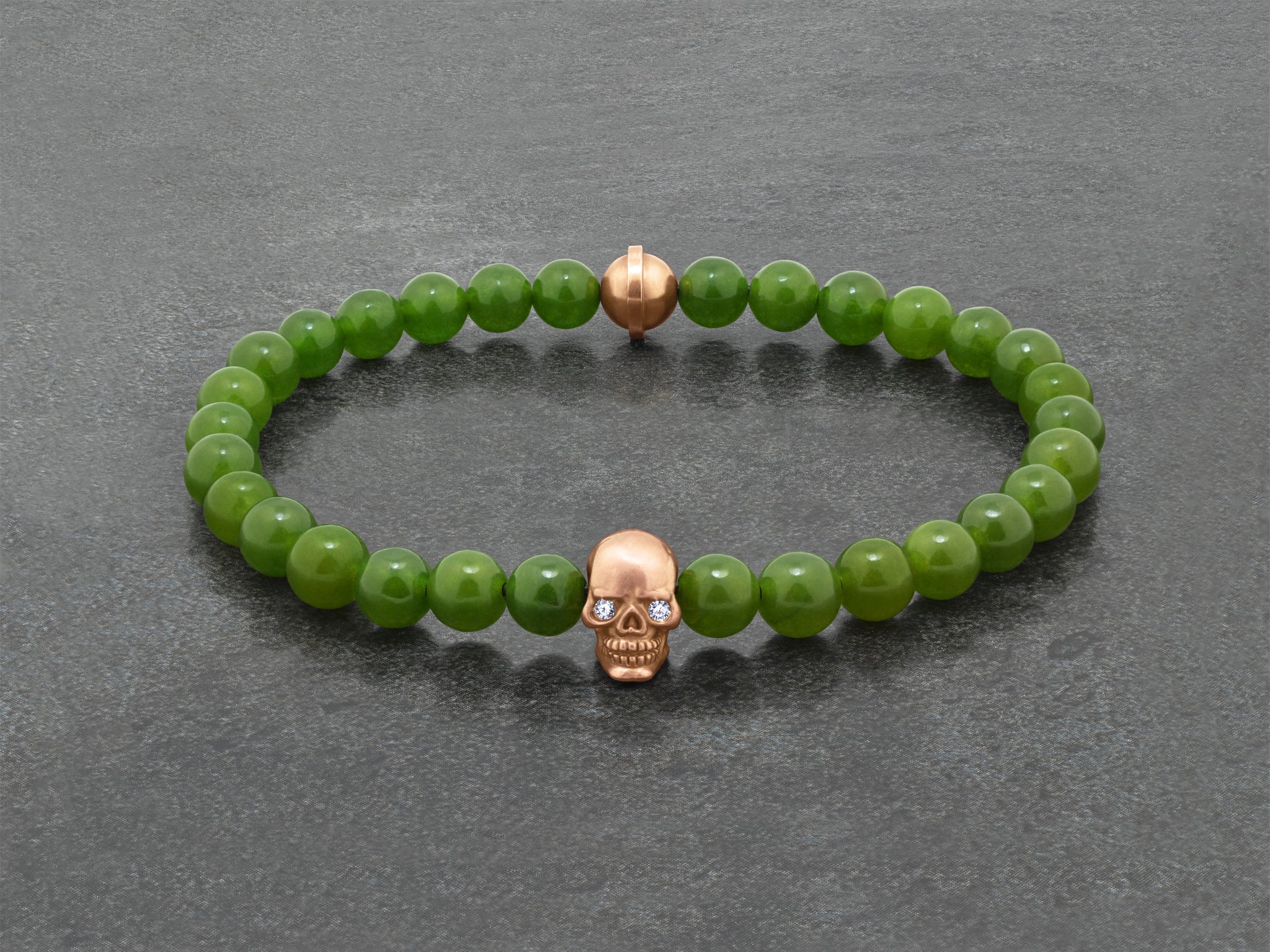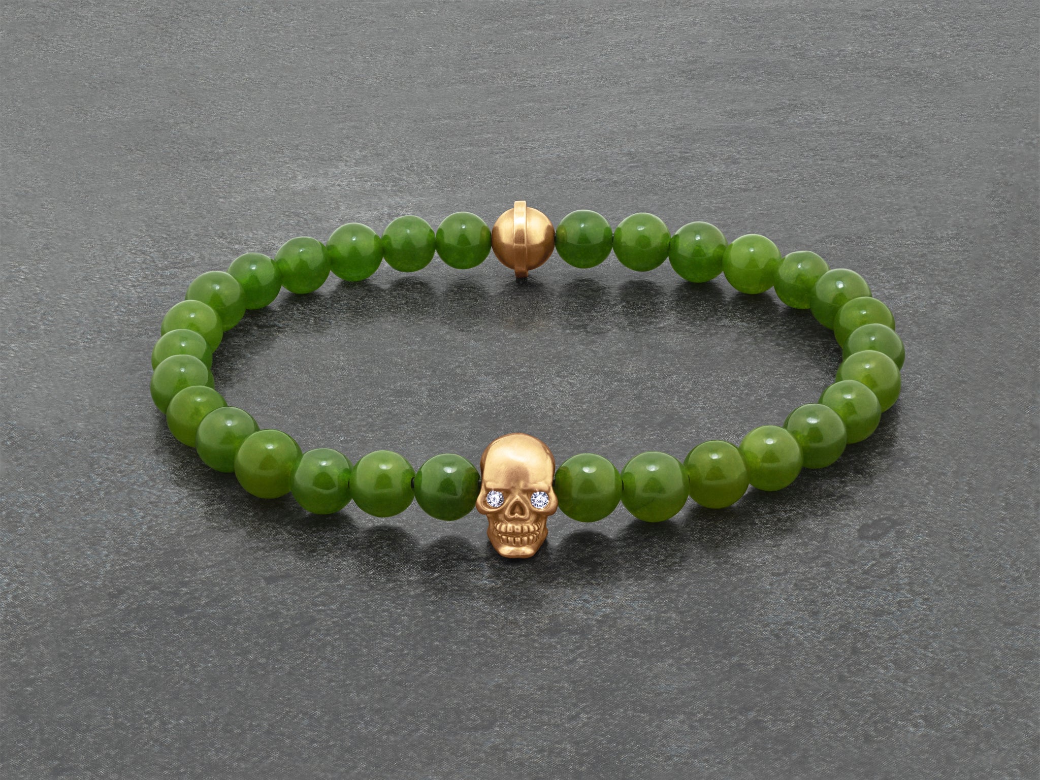 Our luxurious take on everyone's favorite features a string of green jade beads beautifully complemented by rose gold. The handcrafted skull is set with two ideal cut diamond eyes. This slip-on bracelet is assembled on elastic cord to be a cinch to put on and off. Each piece is crafted by a master artisan in our NYC studio.