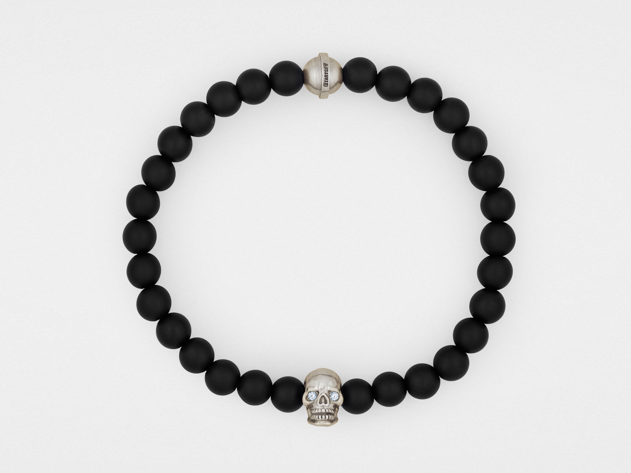 Handcrafted in oxidized sterling silver, the skull is set with two beautiful diamond eyes, giving a level of sophistication to the classic bracelet design. This luxurious take on everyone's favorite features a string of black onyx beads in a matte finish. Each piece is crafted by a master artisan in our NYC studio and assembled on elastic cord.