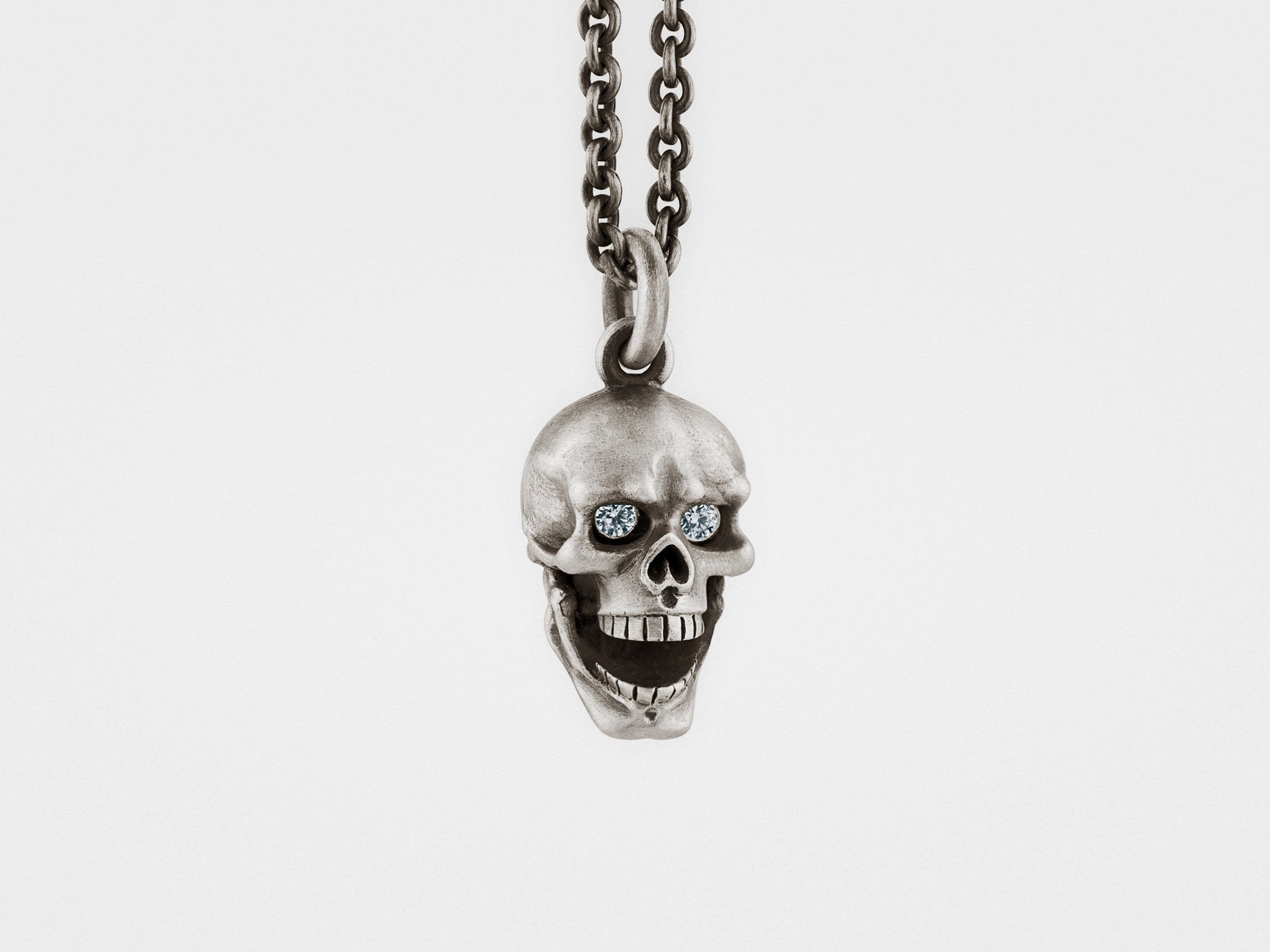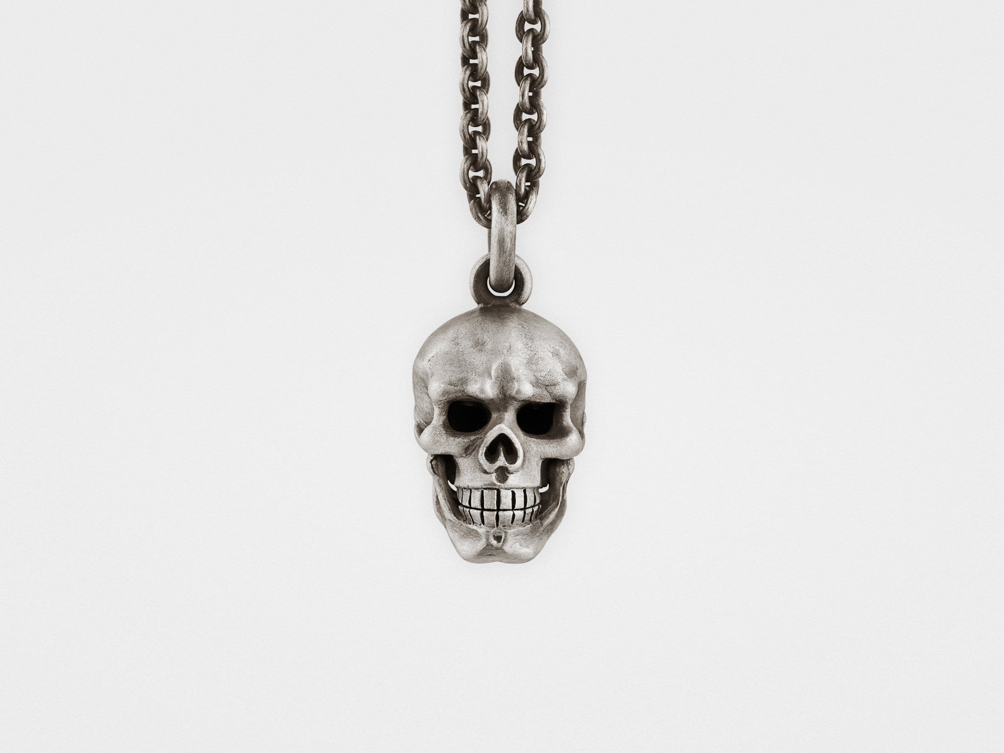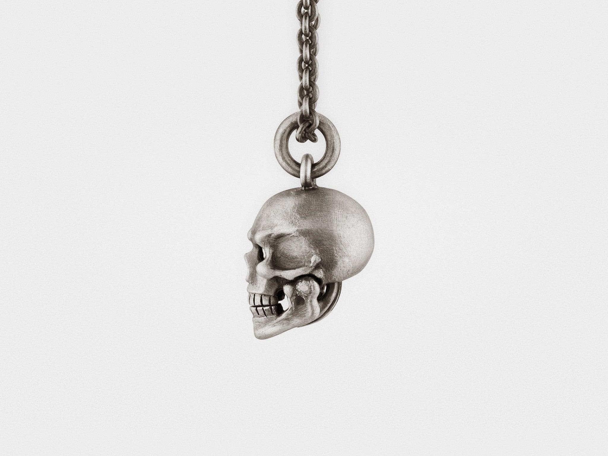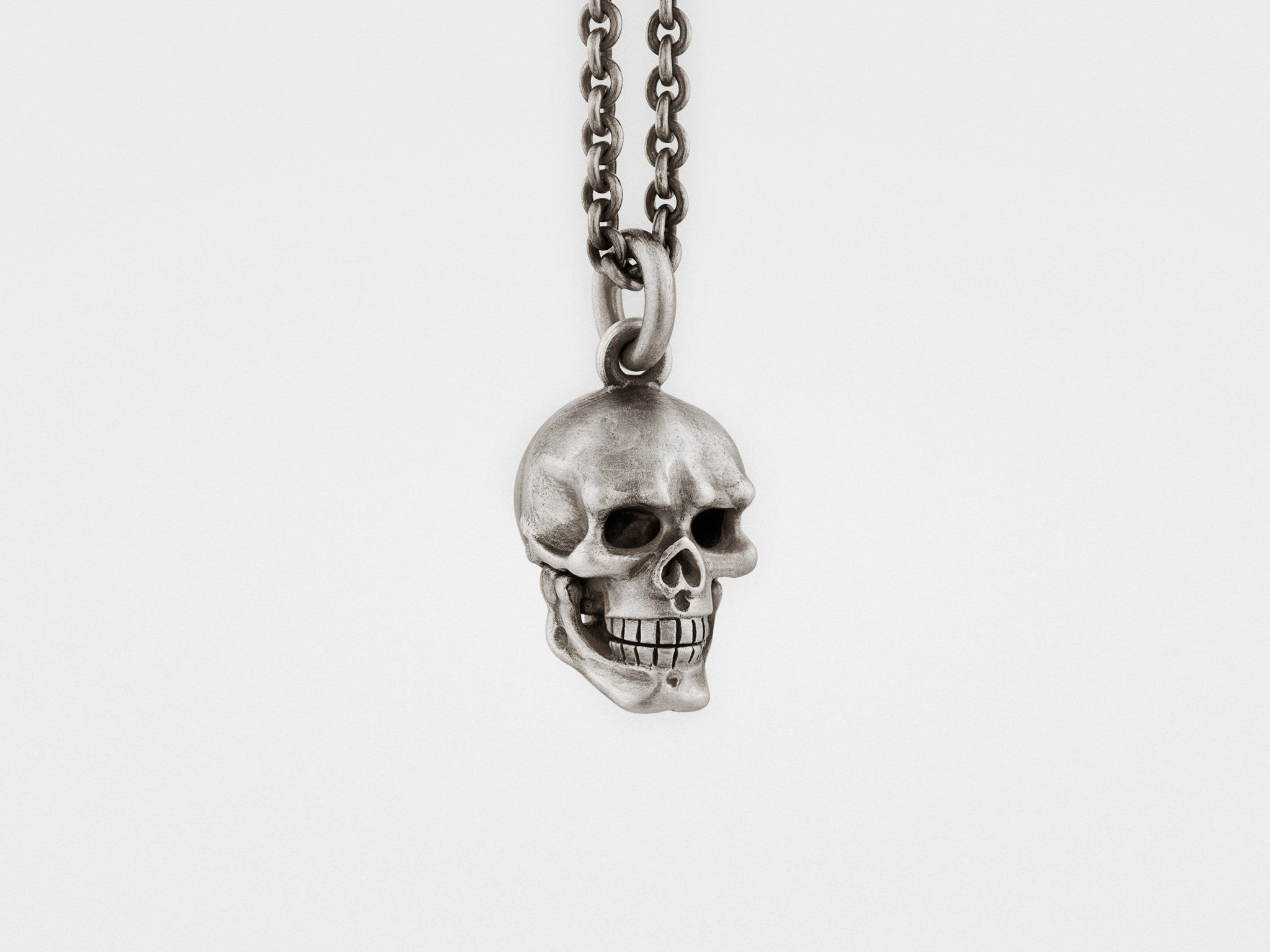Show off your rebellious side with this luxurious pendant. Skull's hinged lower jaw adds a playful touch to this finely crafted piece by opening and closing as you move. Each piece is finished by hand in oxidized silver for a vintage, artisanal look and has a unique patina pattern.
